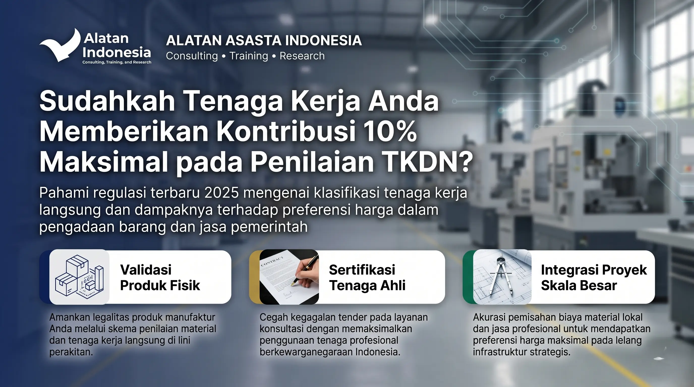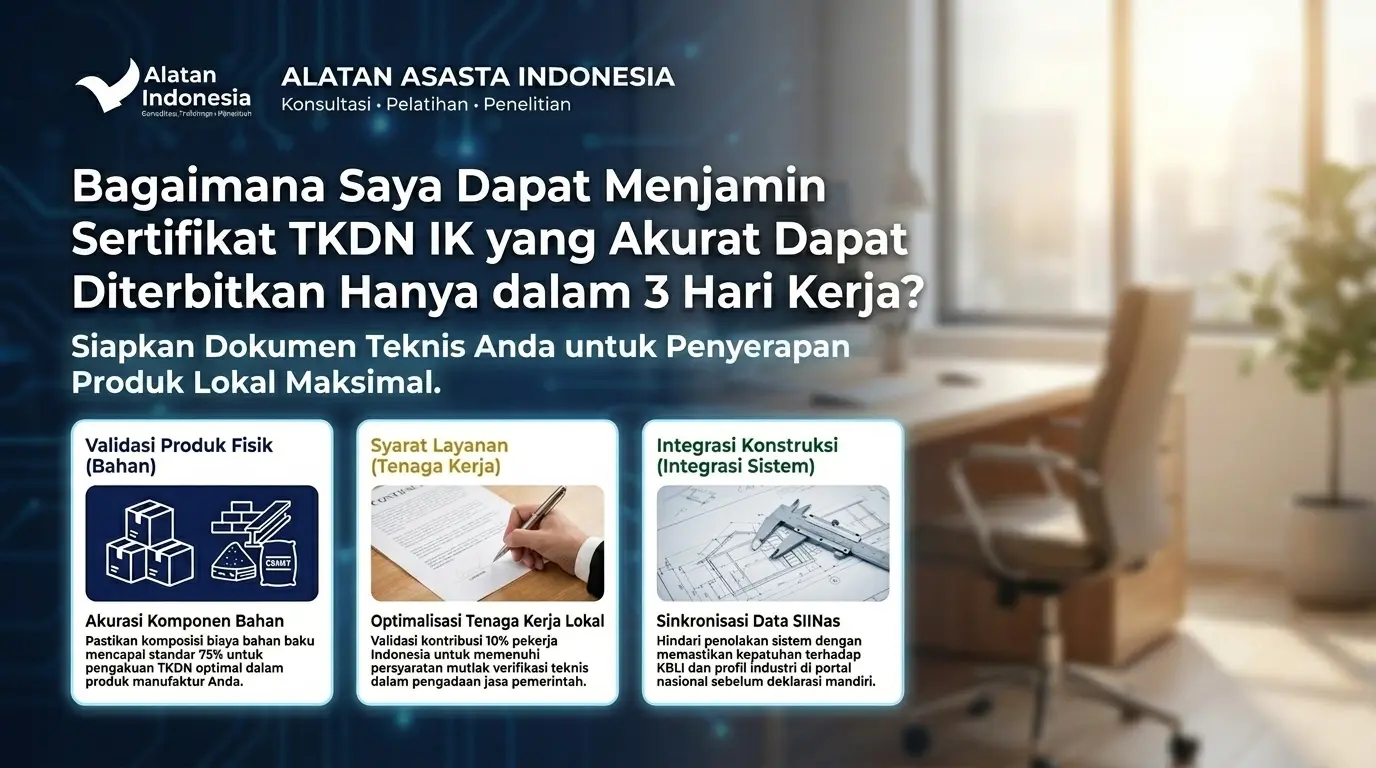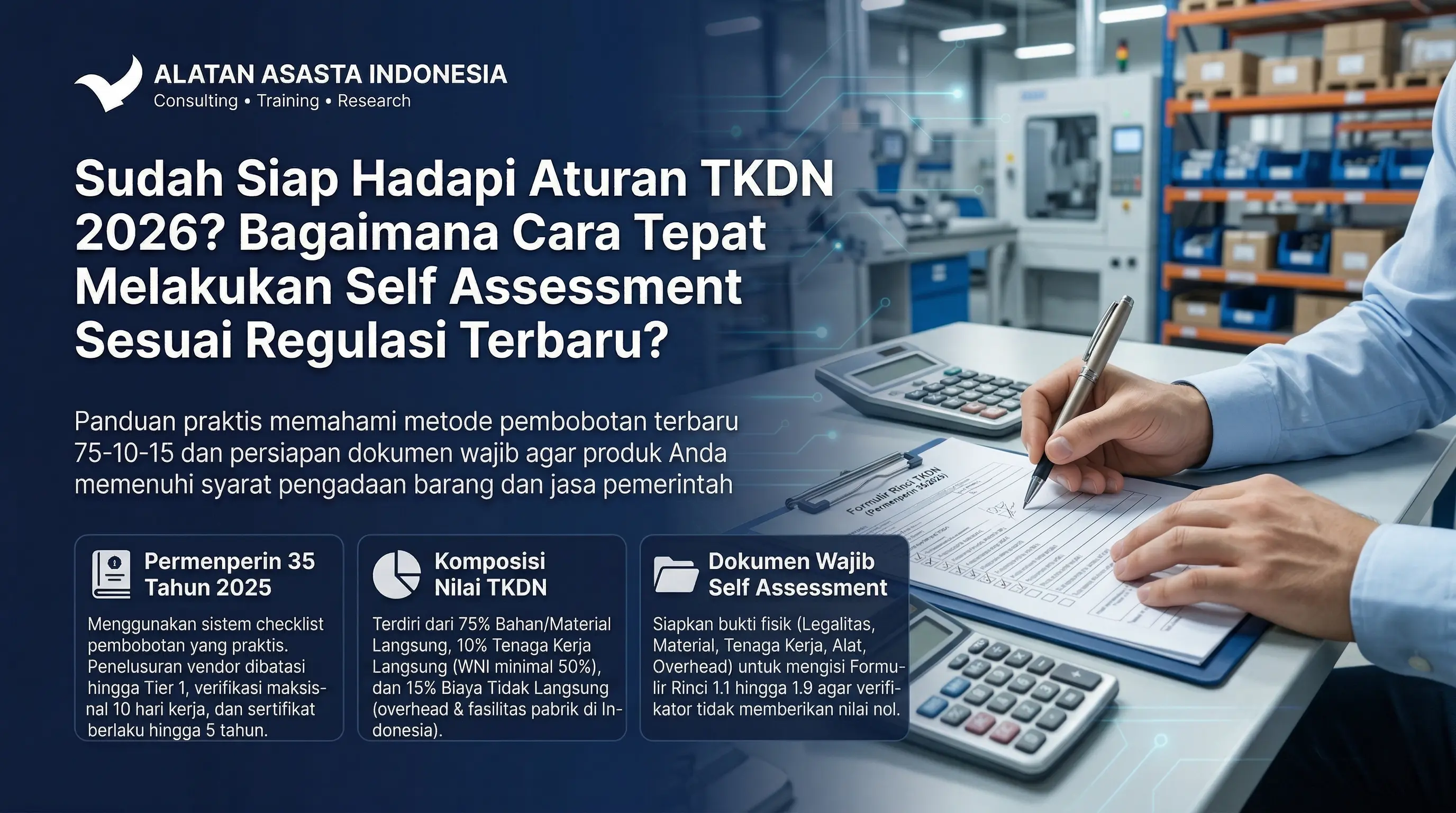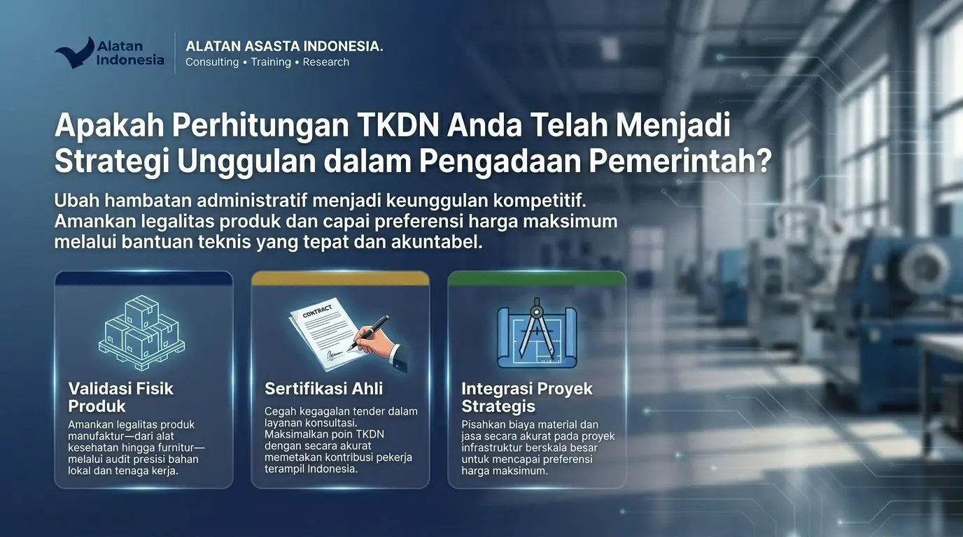 Ingin produk Anda memenangkan Tender Pemerintah tetapi belum punya sertifikat TKDN? Jangan biarkan peluang omzet miliaran dari APBN/APBD melayang hanya karena masalah administrasi. Kami hadir dengan solusi Paket Hemat Sertifikasi TKDN khusus untuk IKM (Industri Kecil Menengah). Apa yang Anda dapatkan dengan Investasi Rp 2 Juta ini? ✅ Pre-Assessment TKDN: Analisis awal potensi nilai TKDN produk Anda. ✅ Pendampingan Dokumen: Bantuan penyusunan berkas (Self-Assessment) agar sesuai standar Kemenperin. ✅ Strategi e-Katalog: Konsultasi agar produk siap tayang di etalase LKPP. ✅ Akses Prioritas: Jalur konsultasi cepat dengan tim ahli berpengalaman 20 tahun. Mengapa Wajib TKDN Sekarang? Sesuai instruksi Presiden tentang P3DN, belanja pemerintah wajib memprioritaskan produk ber-TKDN. Ini adalah tiket emas bisnis Anda untuk naik kelas! Slot Terbatas! Promo ini hanya berlaku untuk 10 pendaftar pertama bulan ini. Segera amankan kuota Anda sebelum harga kembali normal.