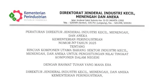 Peraturan Direktur Jenderal Industri Kecil, Menengah, dan Aneka Nomor 263 Tahun 2025 merupakan regulasi teknis pelaksana yang menetapkan daftar rinci Komponen Utama untuk berbagai barang pada sektor Industri Kecil, Menengah, dan Aneka (IKMA).