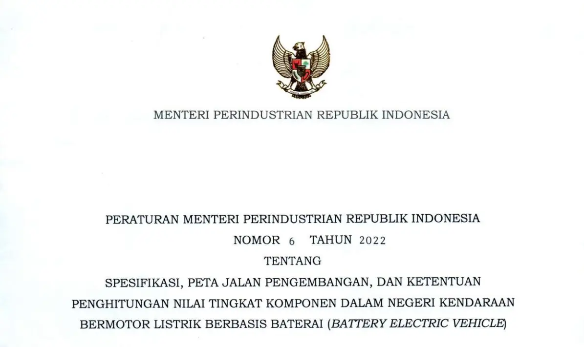 Regulasi terbaru yang merevisi ketentuan teknis dan peta jalan (roadmap) industri kendaraan listrik nasional. Aturan ini memuat penyesuaian skema penghitungan Tingkat Komponen Dalam Negeri (TKDN), khususnya pada aspek manufaktur baterai, spesifikasi komponen utama, serta syarat investasi bagi industri KBL Berbasis Baterai (Battery Electric Vehicle) untuk mencapai target TKDN minimal di tahun 2030 dan seterusnya.