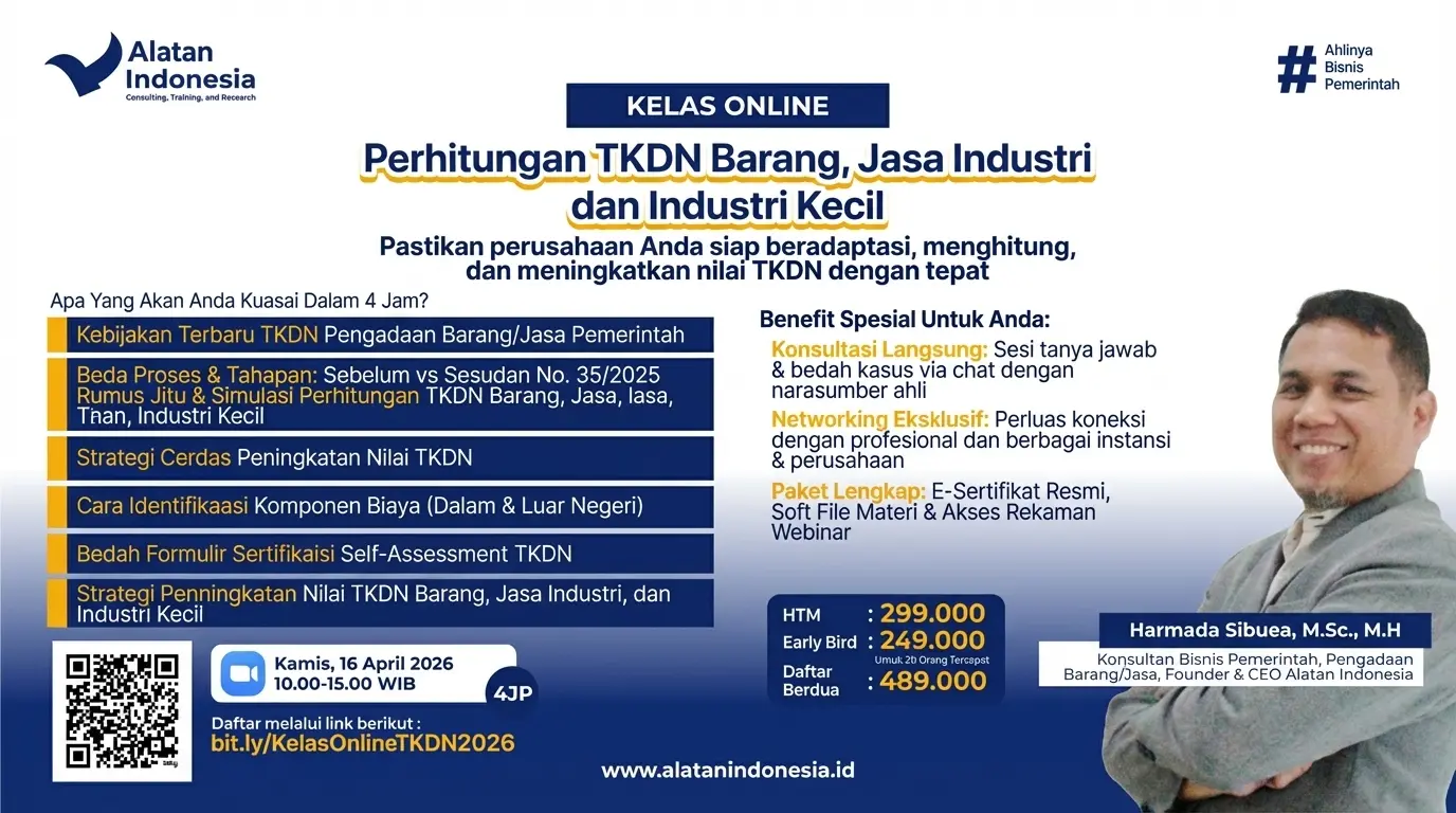 Ingin produk Anda memenangkan Tender Pemerintah tetapi belum punya sertifikat TKDN? Jangan biarkan peluang omzet miliaran dari APBN/APBD melayang hanya karena masalah administrasi. Kami hadir dengan solusi Paket Hemat Sertifikasi TKDN khusus untuk IKM (Industri Kecil Menengah). Apa yang Anda dapatkan dengan Investasi Rp 2 Juta ini? ✅ Pre-Assessment TKDN: Analisis awal potensi nilai TKDN produk Anda. ✅ Pendampingan Dokumen: Bantuan penyusunan berkas (Self-Assessment) agar sesuai standar Kemenperin. ✅ Strategi e-Katalog: Konsultasi agar produk siap tayang di etalase LKPP. ✅ Akses Prioritas: Jalur konsultasi cepat dengan tim ahli berpengalaman 20 tahun. Mengapa Wajib TKDN Sekarang? Sesuai instruksi Presiden tentang P3DN, belanja pemerintah wajib memprioritaskan produk ber-TKDN. Ini adalah tiket emas bisnis Anda untuk naik kelas! Slot Terbatas! Promo ini hanya berlaku untuk 10 pendaftar pertama bulan ini. Segera amankan kuota Anda sebelum harga kembali normal.