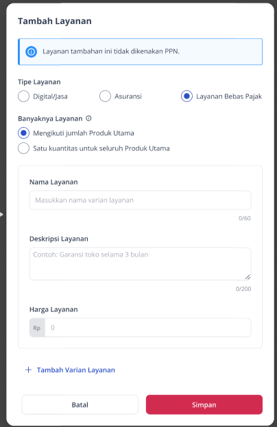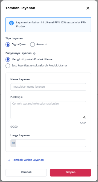Selanjutnya, Penyedia dapat memasukkan layanan tambahan untuk setiap produk yang didaftarkan. Layanan tambahan dapat berupa produk digital, jasa, dan asuransi.
