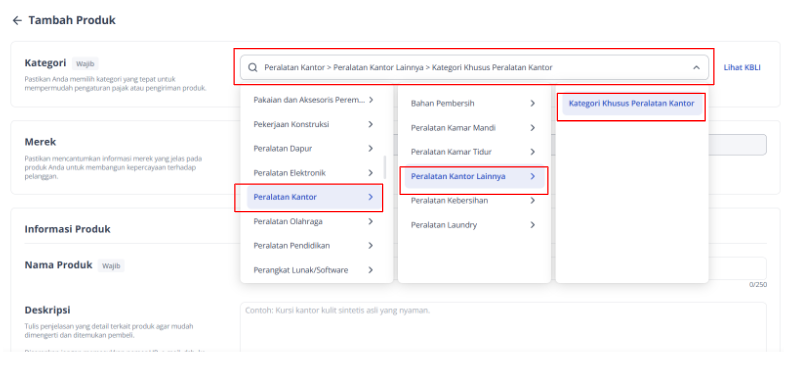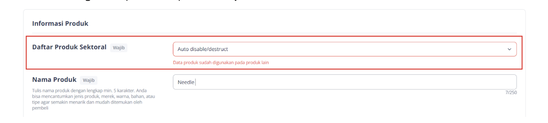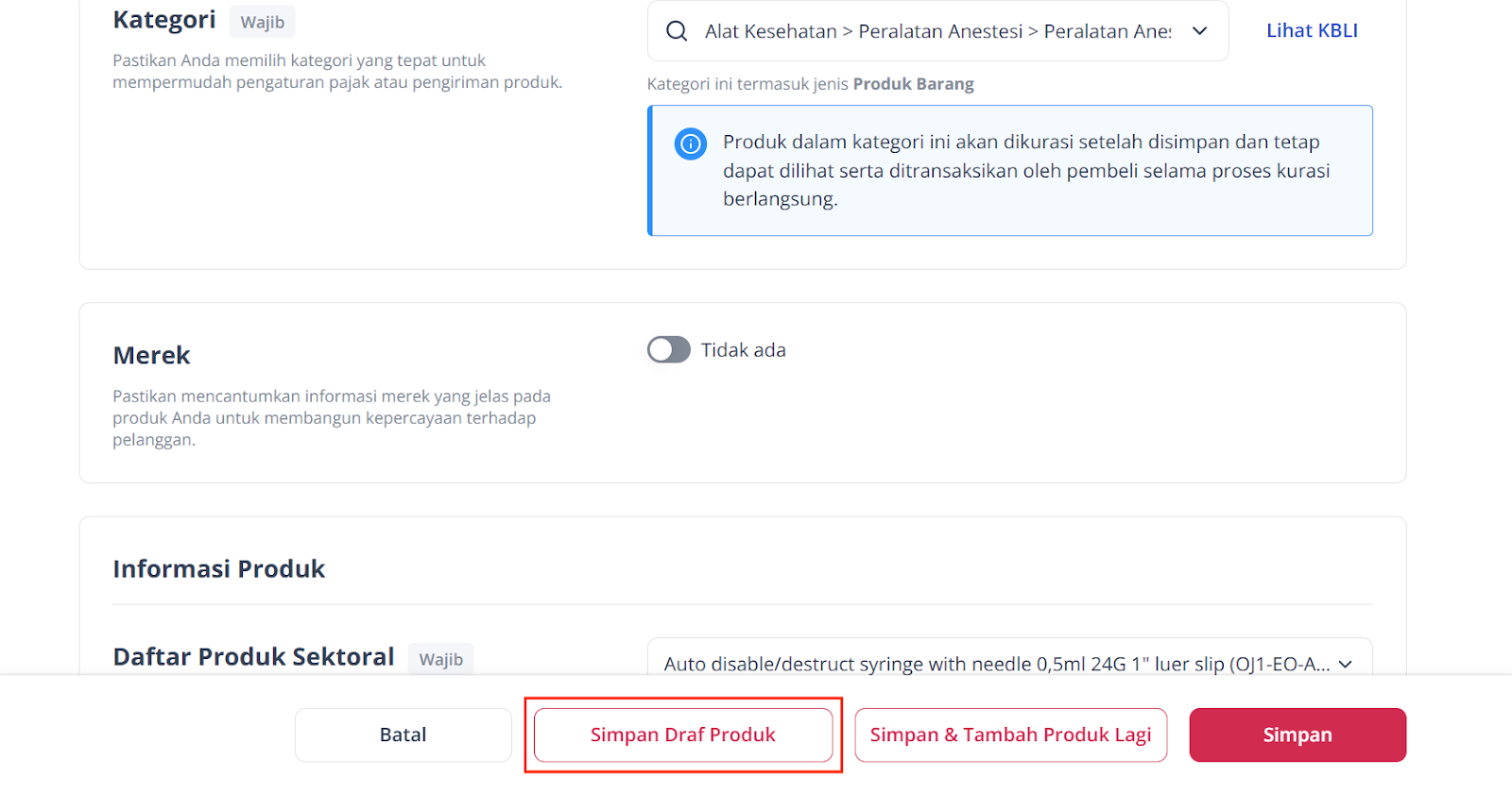 Penyedia wajib mengisi atribut berupa kategori, daftar produk sektoral, dan nama produk, sebelum menyimpan produk sebagai draft.