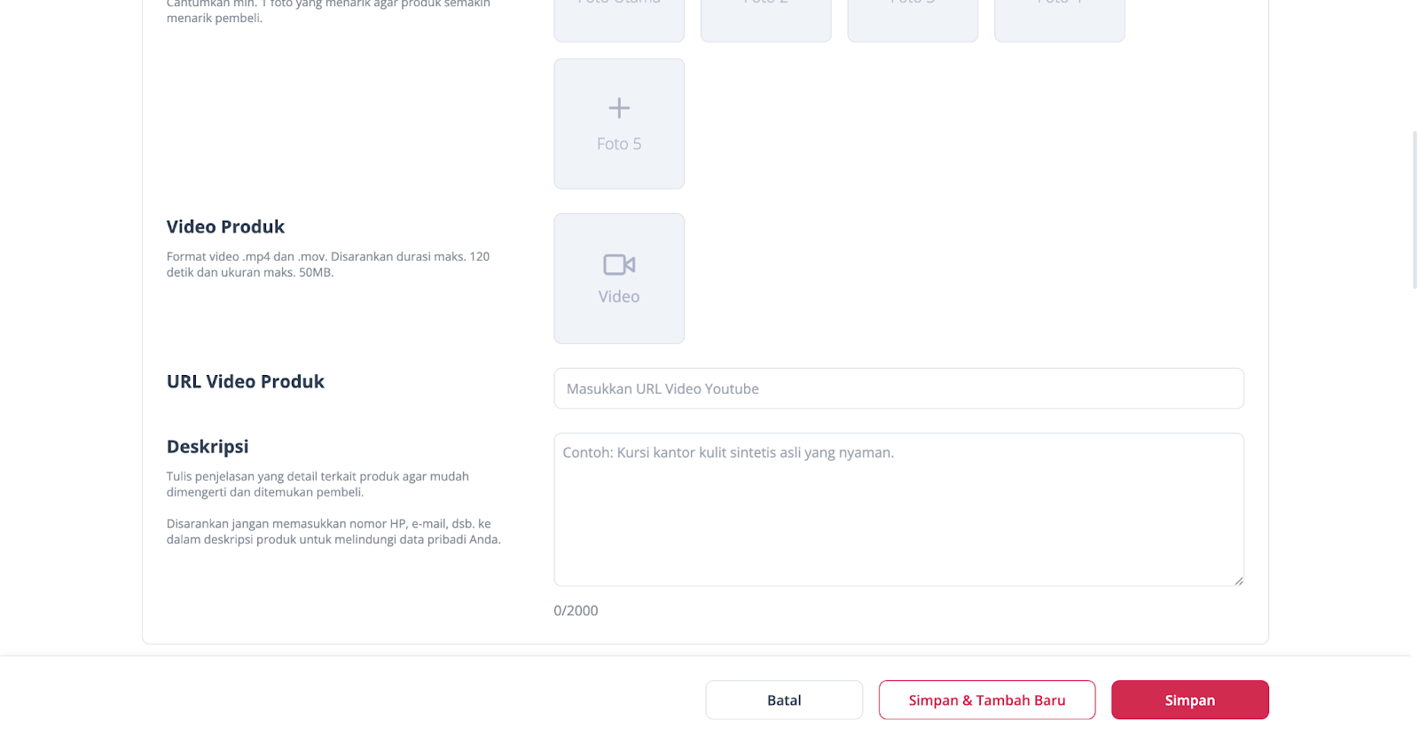 Masukkan detail deskripsi dari Produk yang berisikan penjelasan secara rinci terkait Produk agar dapat dengan mudah dimengerti oleh Pembeli.