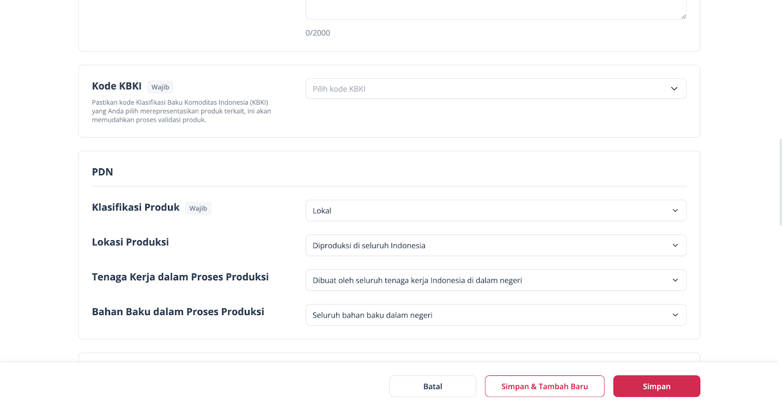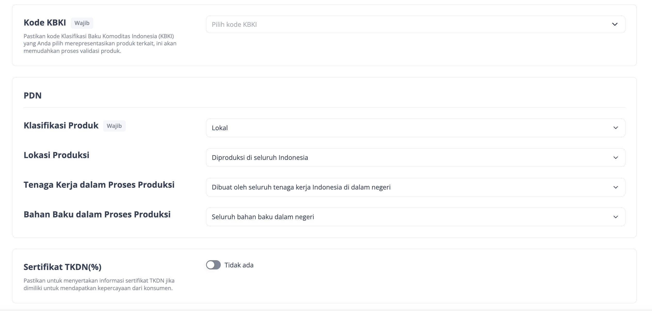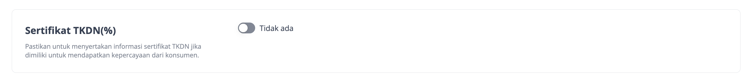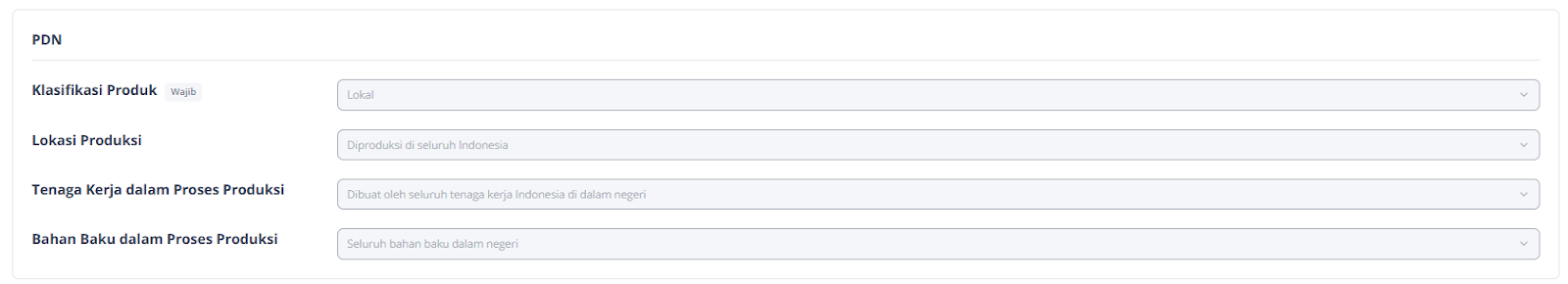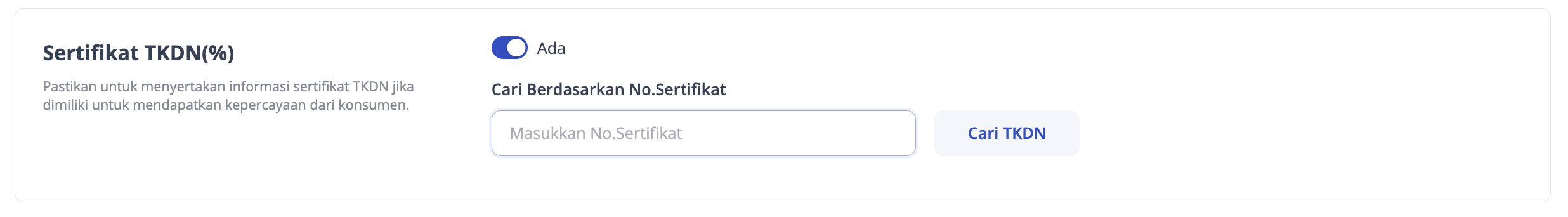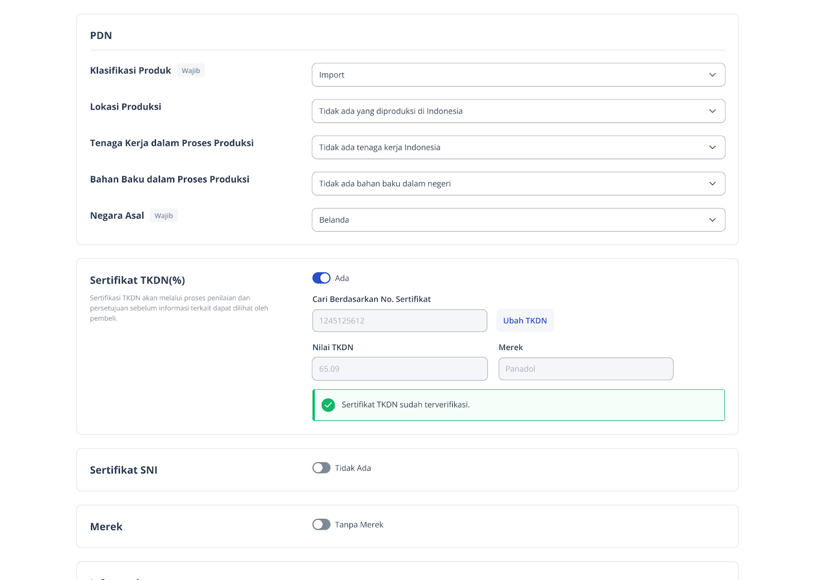 Produk dengan klasifikasi lokal dapat melakukan pengisian informasi Sertifikat TKDN (%). Namun, jika klasifikasi produk adalah impor maka sertifikat TKDN tidak dapat diisi.