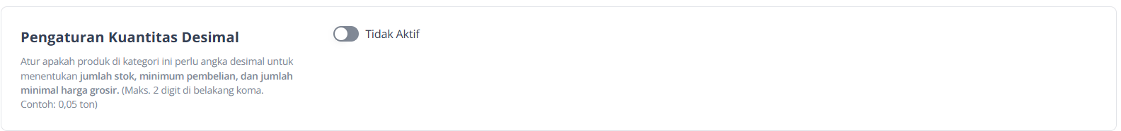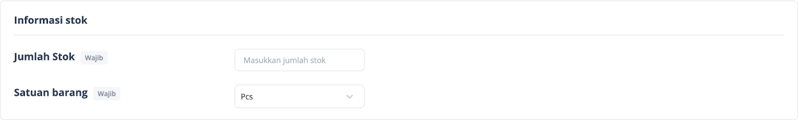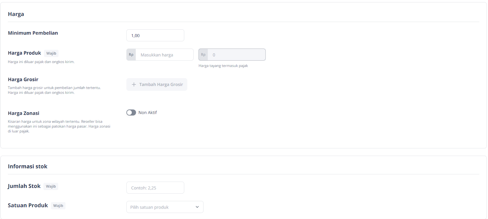 Jika produk yang didaftarkan memiliki varian, maka Penyedia hanya perlu mengisikan informasi Minimum Pembelian dan Satuan Barang. Harga yang terbentuk akan mengikuti harga Varian. Namun, jika Produk yang didaftarkan tidak memiliki varian, maka Penyedia diwajibkan untuk mengisi informasi mengenai harga dan informasi stok pada bagian ini.