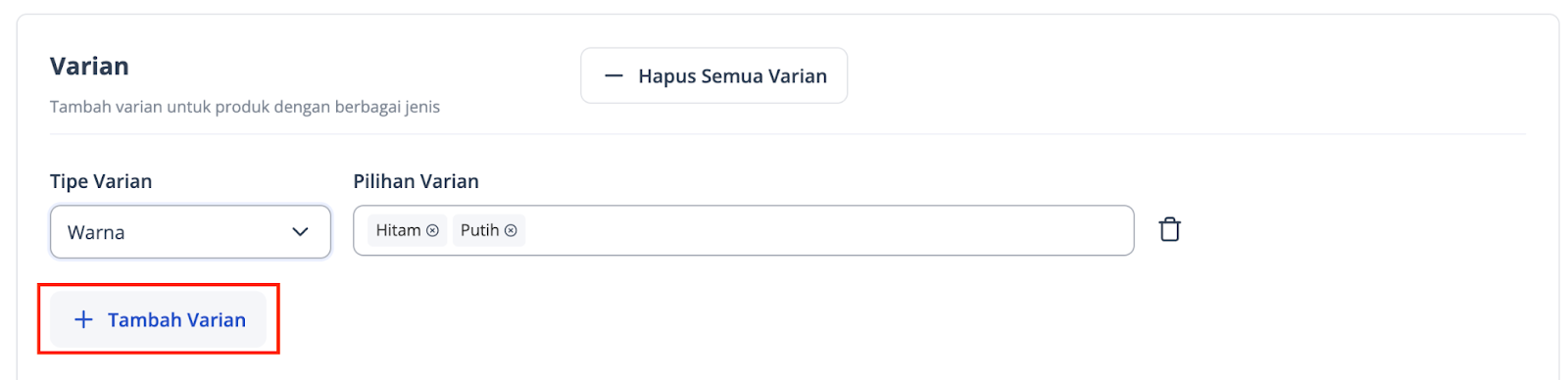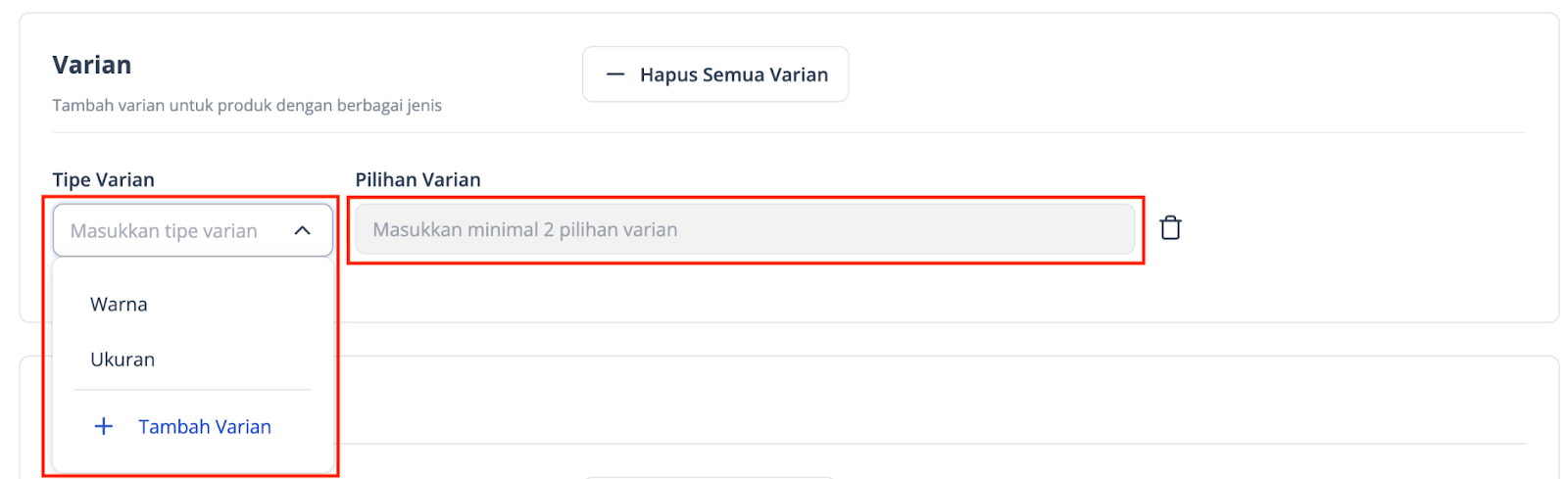 Jika pada produk terdapat lebih dari 1 tipe varian, maka Penyedia dapat menambahkan varian yang lainnya. Maksimal kombinasi varian yang dapat ditambahkan adalah 2.