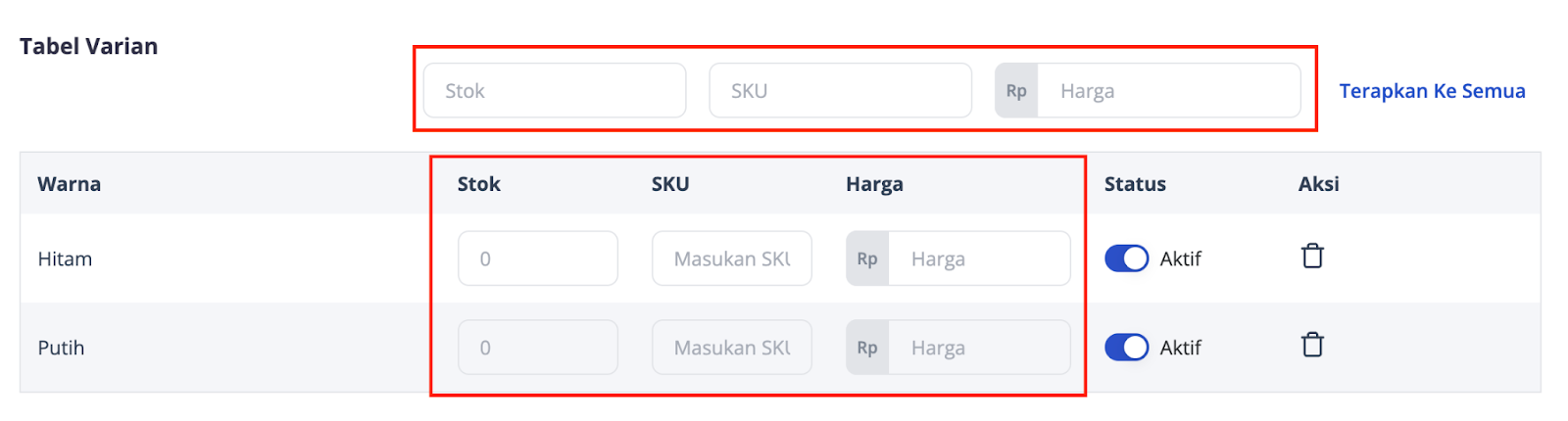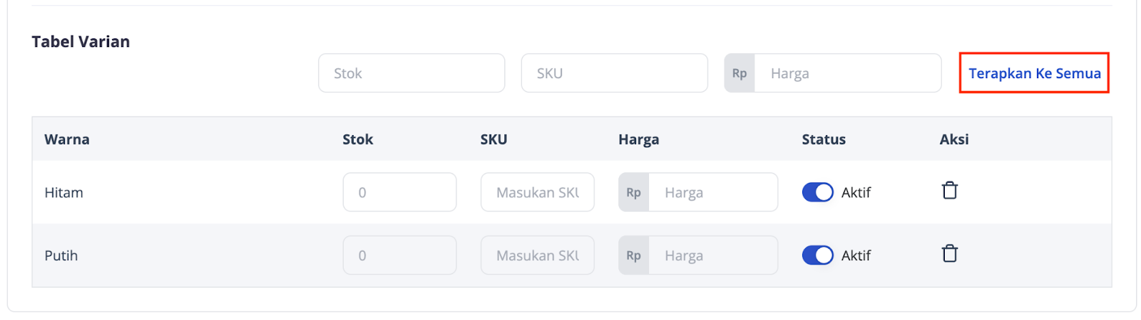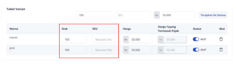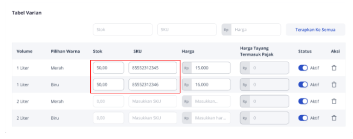 Jika Jumlah Stok dan Harga untuk seluruh list varian sama, maka Penyedia dapat langsung mengisikan detail Jumlah Stok dan Harga untuk semua varian pada kolom Stok dan Harga yang berada di paling atas, lalu klik tombol “Terapkan Ke Semua”. Perlu diperhatikan bahwa harga yang dimasukkan adalah harga produk sebelum dikenakan pajak Pertambahan Nilai (PPN).