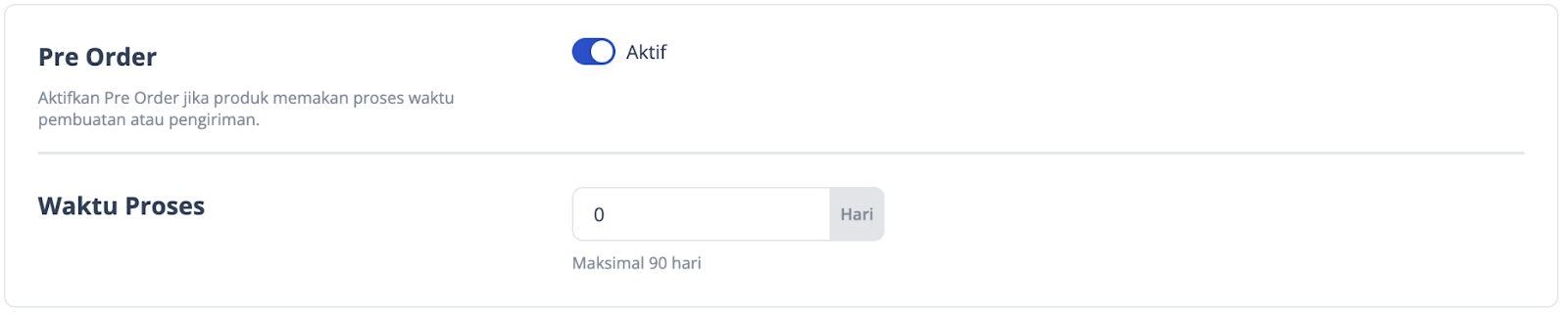 Lalu setelah status Pre-Order telah diaktifkan, Penyedia harus mengisikan kolom Waktu Proses Barang untuk dapat memberikan informasi kepada Pembeli terkait berapa lama Produk akan dapat diproses, maksimal waktu untuk Pre-Order adalah 90 (sembilan puluh) hari.