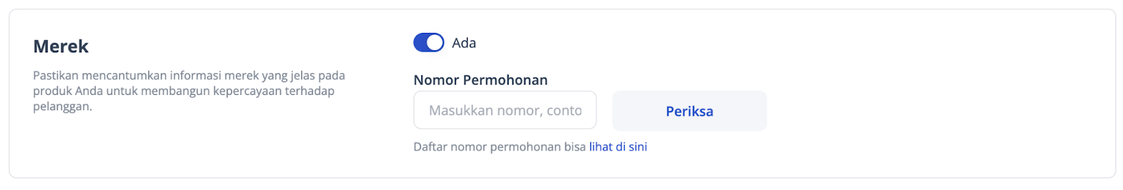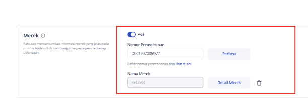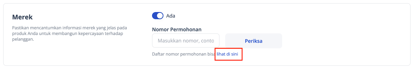 Produk sektoral obat dan alat kesehatan yang akan didaftarkan dapat melengkapi detail informasi mengenai merek yang dimiliki dengan memasukkan nomor permohonan merek. Jika Penyedia tidak mengetahui nomor permohonan merek, maka Penyedia dapat melakukan pencarian pada sistem Pangkalan Data Kekayaan Intelektual dengan cara klik “lihat di sini”.