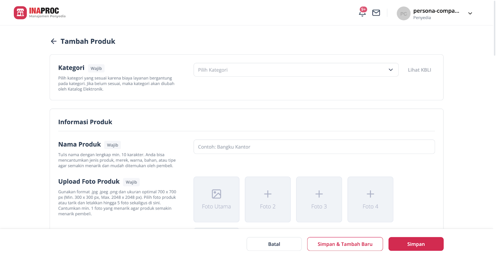 Penyedia wajib mengisi atribut berupa kategori dan nama produk, sebelum menyimpan produk sebagai draft.
