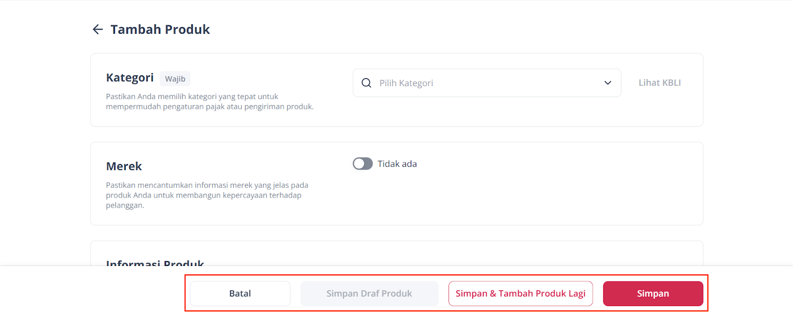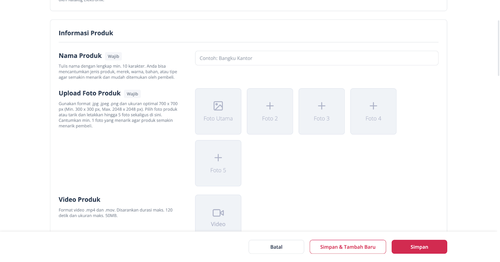 Tombol “Simpan dan Tambah Produk Lagi”: Digunakan untuk menyimpan produk untuk masuk ke proses kurasi dan ditayangkan. Setelah klik tombol ini, pengguna tetap berada di halaman Tambah Produk.