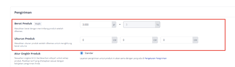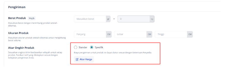 Setelah itu, Untuk jenis produk fisik Penyedia diwajibkan untuk mengisi informasi yang berkaitan dengan pengiriman barang dan mengaktifkan opsi kurir pengiriman. Hal yang perlu diperhatikan terkait informasi pengiriman adalah kolom spesifikasi berat tidak akan dimunculkan jika produk yang didaftarkan adalah produk jasa dan digital.