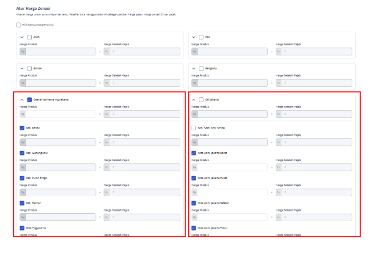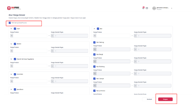 Apabila penyedia hanya ingin menerapkan harga zonasi pada beberapa Kota/Provinsi dapat dilakukan dengan memilih Kota/Provinsi yang diinginkan. Setelah itu penyedia dapat mengisi harga zonasi dari produk yang didaftarkan. Jika sudah mengisi harga zonasi, penyedia dapat klik “Simpan”.
