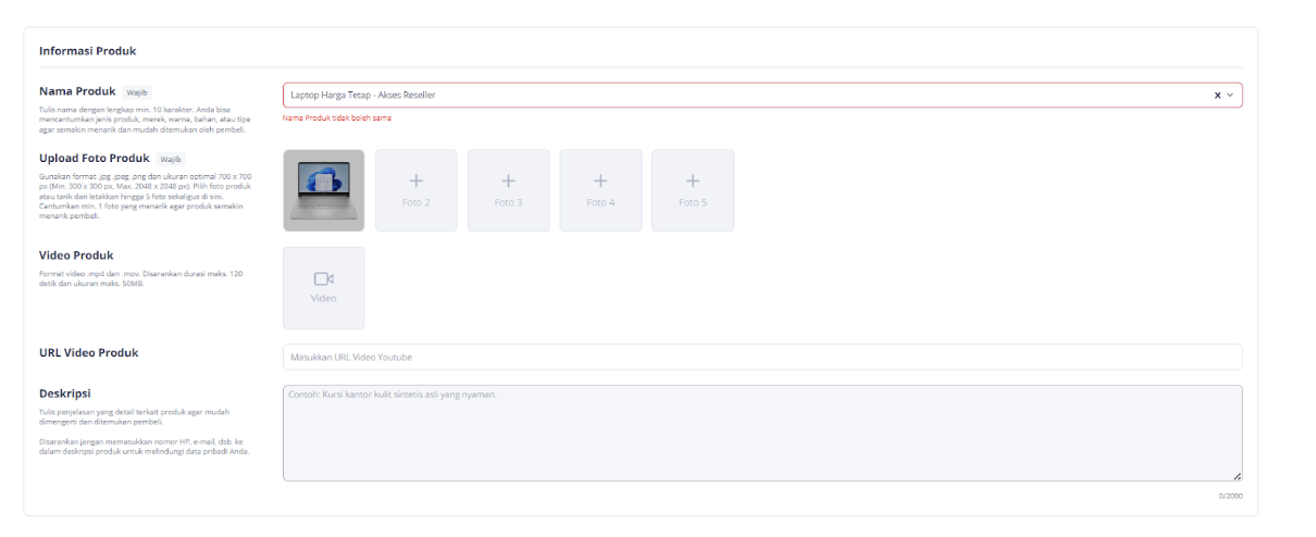 Upload Foto Produk: Foto utama dari master produk tidak dapat diubah atau dihapus namun Penyedia Reseller dapat menambahkan foto