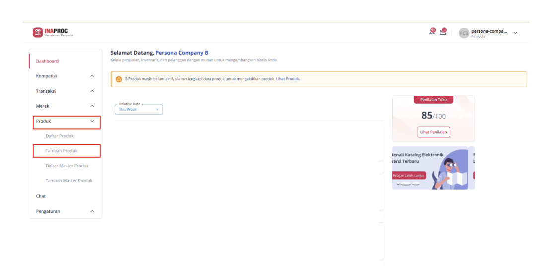 Jika Penyedia ingin melakukan proses penambahan Produk Kategori Konstruksi melalui menu Tambah Produk, maka klik menu “Produk”, lalu pilih opsi “Tambah Produk” pada menu bar yang terdapat pada sebelah kiri halaman.