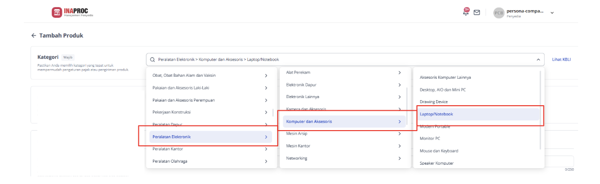 Penyedia Reseller memilih kategori yang diinginkan, kemudian sistem secara otomatis akan memastikan KBLI penyedia sesuai dengan kategori yang dipilih