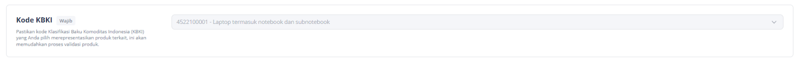 Langkah selanjutnya, Penyedia akan diminta untuk memasukkan informasi Klasifikasi Baku Komoditas Indonesia (KBKI). Pilihan KBKI yang tersedia, akan bergantung dari kategori produk obat dan alat kesehatan level 2 dan 3 yang sebelumnya telah dipilih oleh Penyedia.