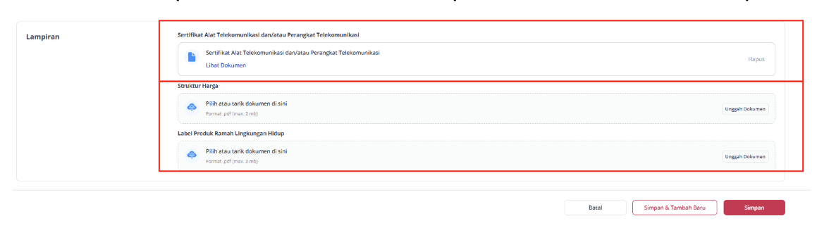 Selanjutnya tahap terakhir yang perlu penyedia lakukan yaitu melengkapi berkas lampiran. Berkas yang perlu dilengkapi sesuai dengan kategori obat dan alat kesehatan yang sebelumnya telah dipilih. Ketentuan lampiran yang dapat diunggah adalah dokumen dalam format pdf dengan ukuran maksimal 2 mb.