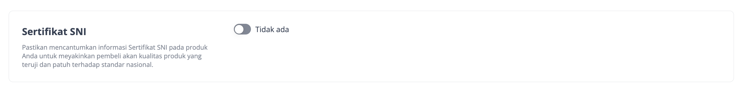 Penyedia yang memiliki sertifikat SNI pada produk yang akan ditayangkan dapat menekan tab sertifikat SNI untuk dapat melengkapi informasi sertifikat SNI. Jika penyedia tidak memiliki sertifikat SNI pada produk yang akan didaftarkan, maka tidak perlu menekan tab sertifikat SNI.