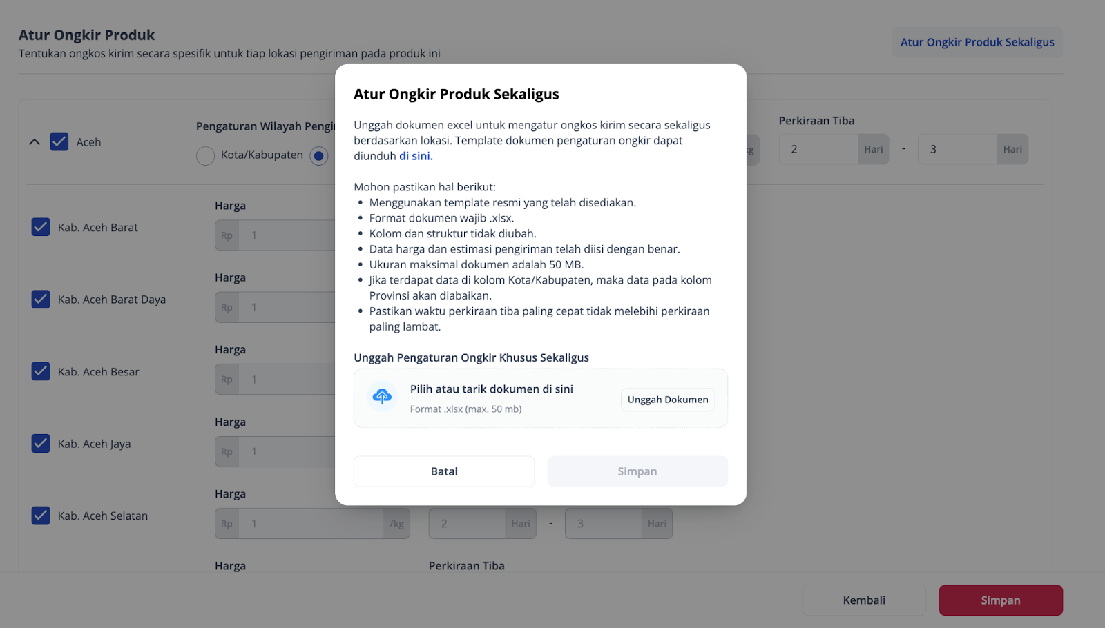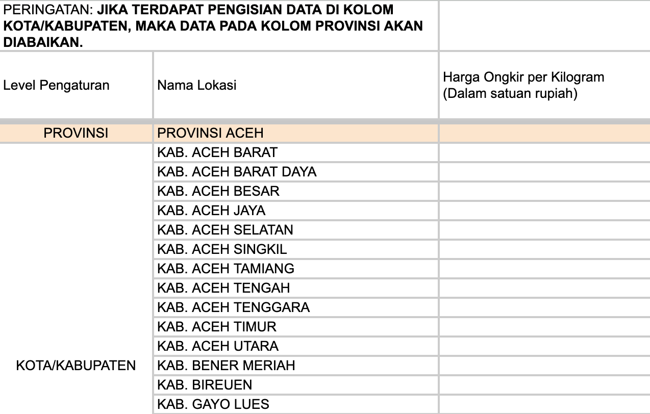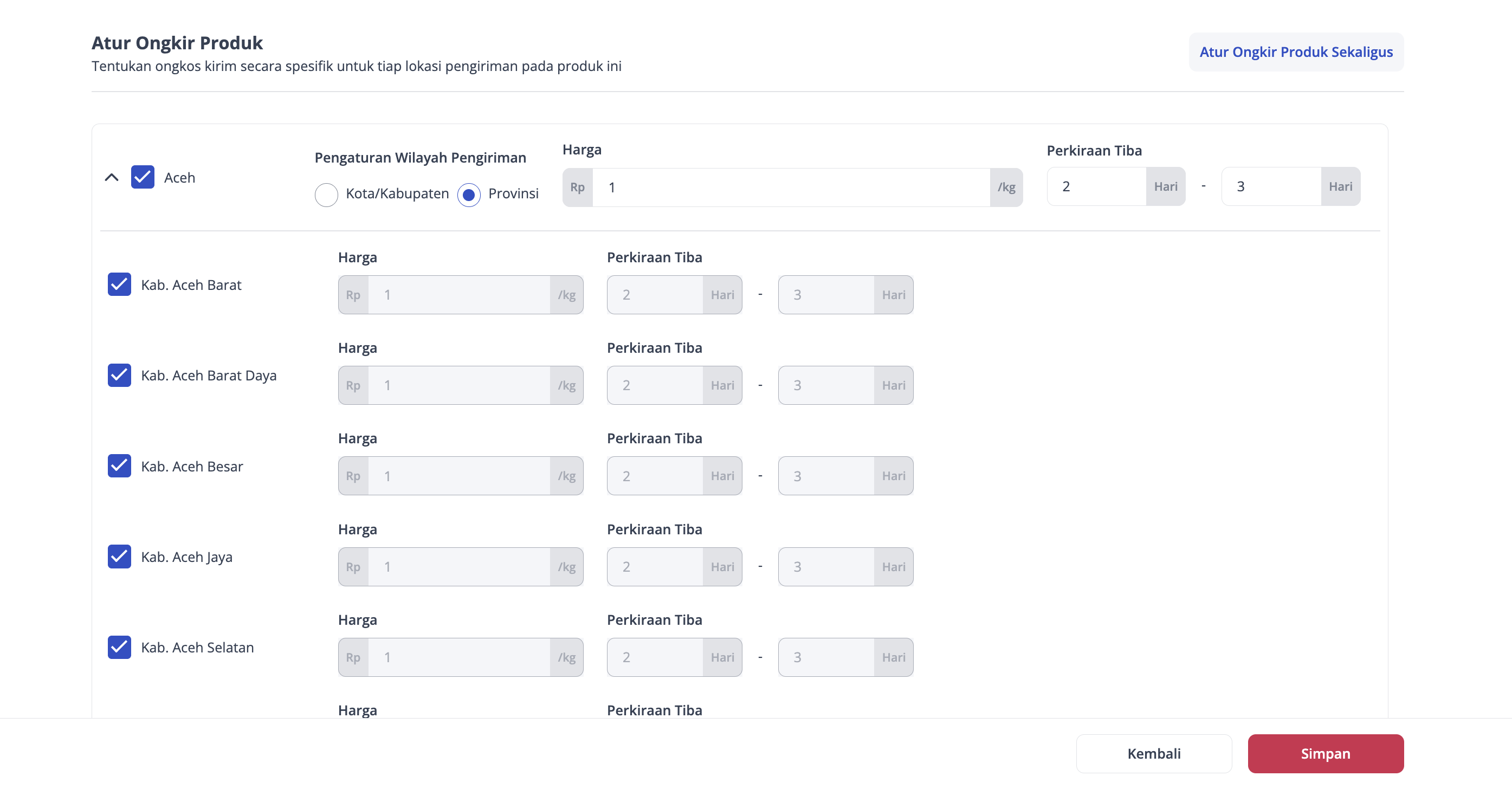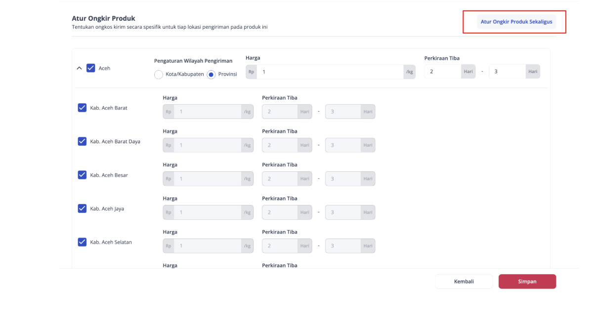 Konfigurasi Tingkatan Wilayah: Pastikan tidak terdapat pengisian ongkir dan estimasi di level Provinsi dan Kabupaten untuk satu provinsi yang sama secara bersamaan.