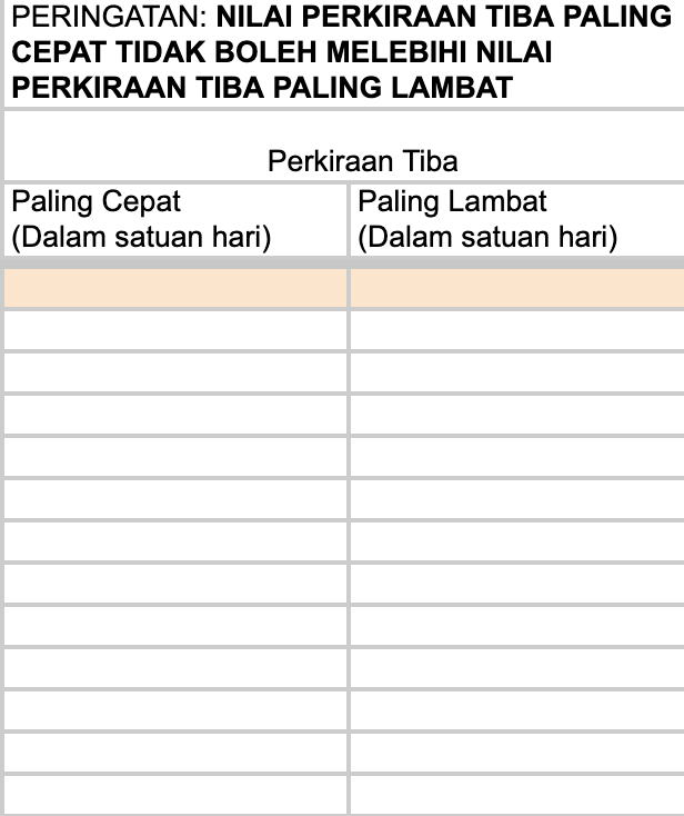 - Aturan Estimasi Perkiraan Tiba: Perkiraan tiba paling cepat tidak boleh lebih besar dari perkiraan tiba paling lambat. Jika terjadi, pengunggahan akan gagal.