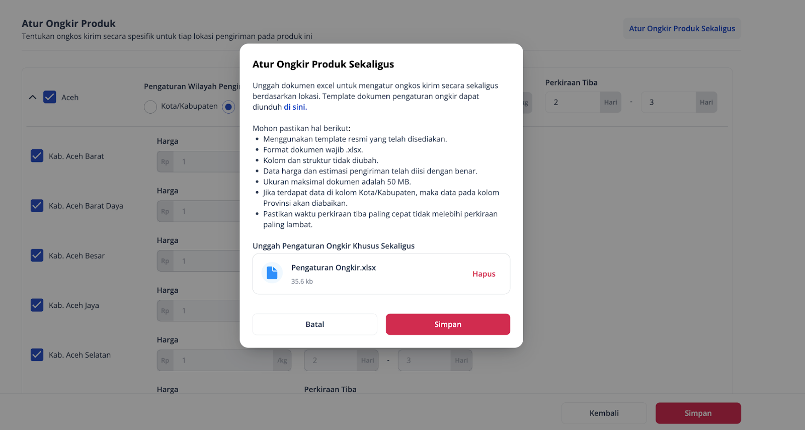 Selanjutnya, setelah dokumen atur ongkir produk sekaligus berhasil diunggah dan Penyedia klik simpan maka sistem akan langsung diimplementasikan di pengaturan spesifik untuk produk yang dipilih tersebut.