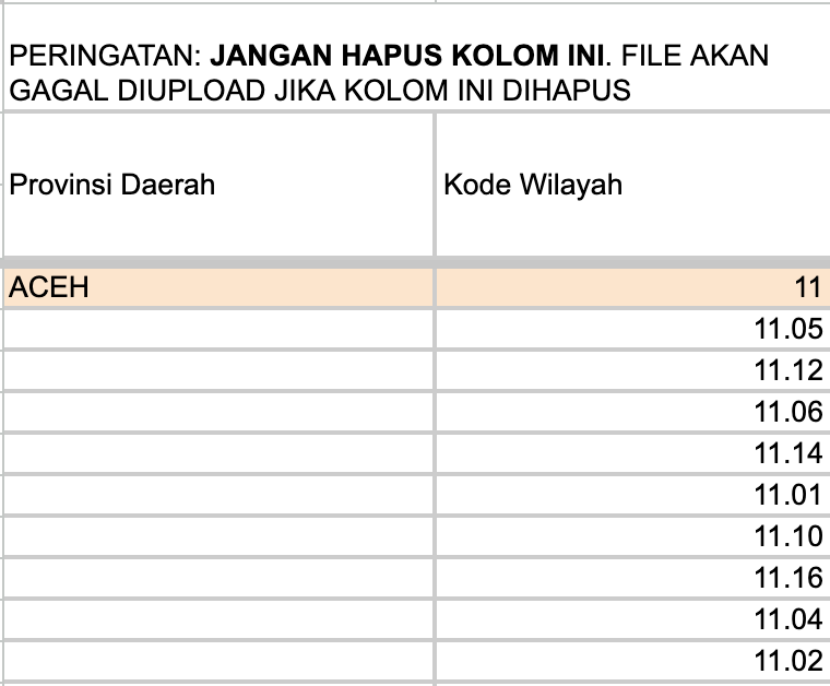 Struktur Kolom: Jangan menghapus kolom Provinsi daerah dan Kode Wilayah. Penghapusan kolom akan membuat file tidak dapat diunggah.