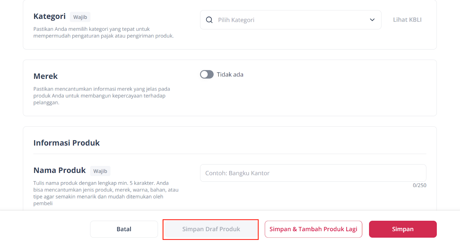 Jika penyedia belum mengisi kategori dan/atau nama produk, maka tombol “Simpan sebagai draft” belum aktif.