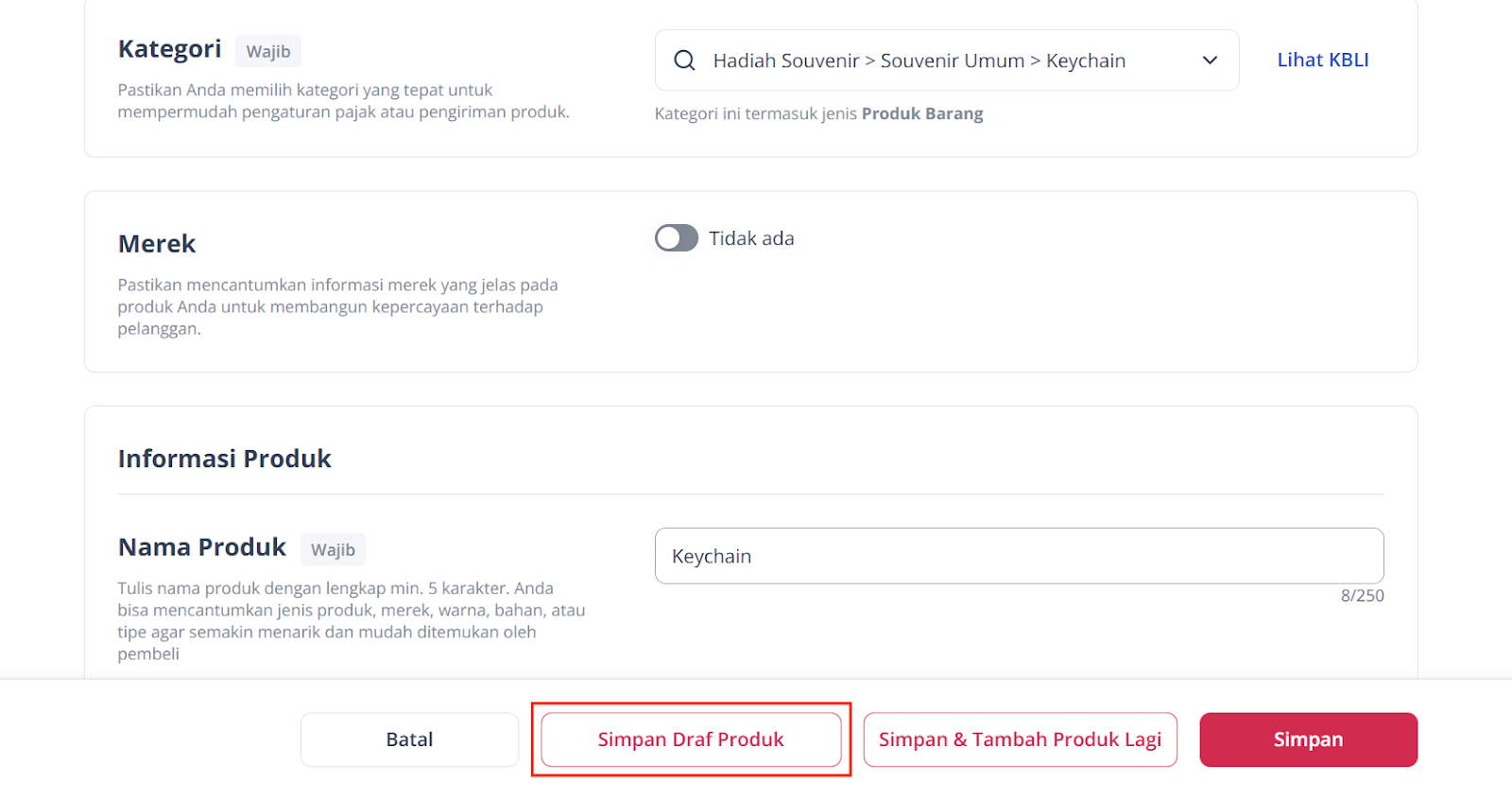 Berikut langkah-langkah untuk menyimpan produk sebagai draft pada kategori umum: