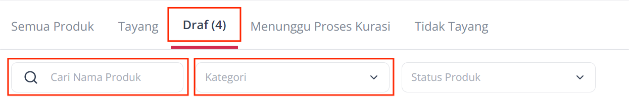 Gunakan fitur pencarian dengan filter nama produk atau filter kategori untuk menemukan draft produk tertentu.
