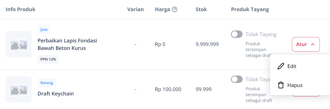 - Hapus: Menghapus draft produk jika sudah tidak dibutuhkan.